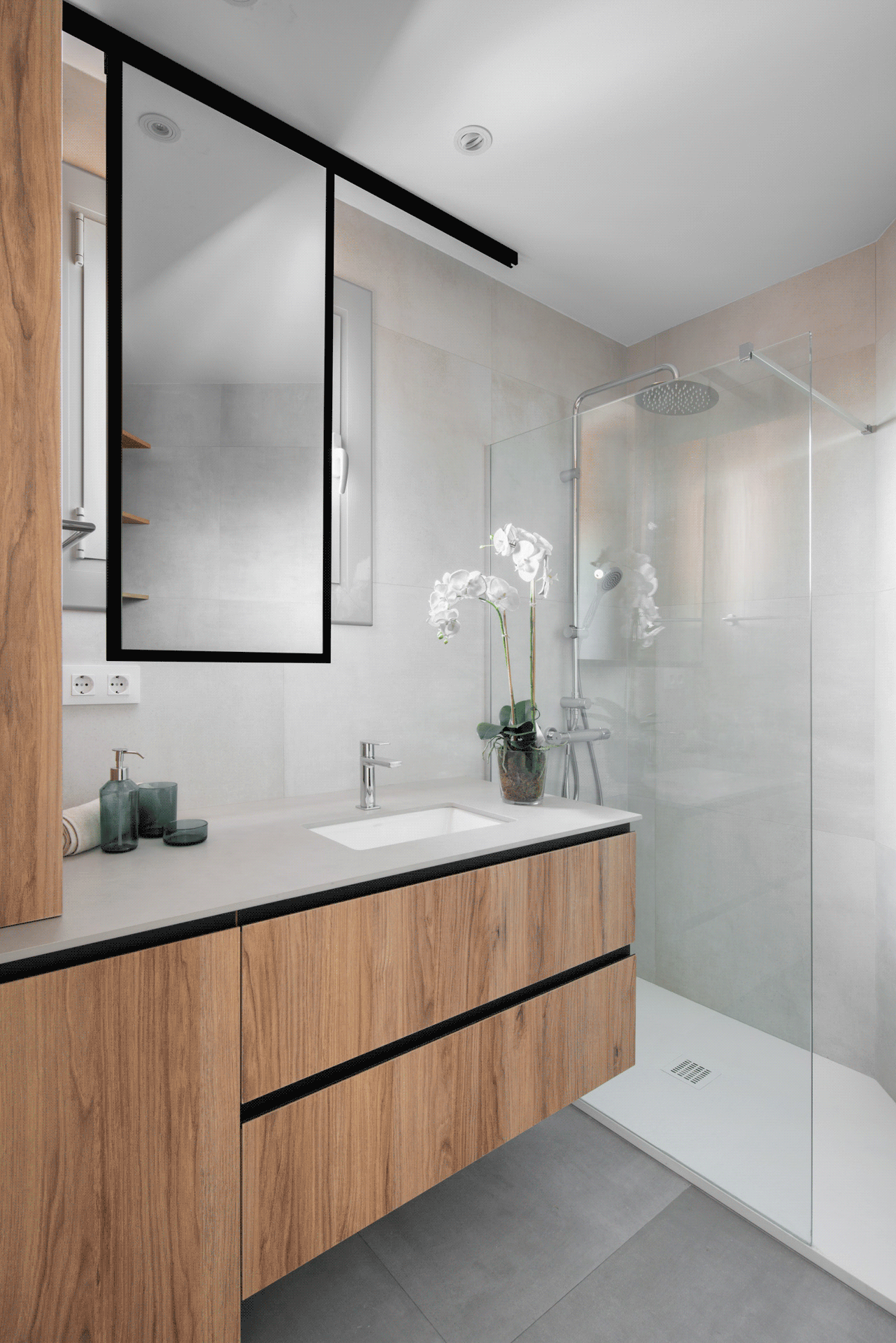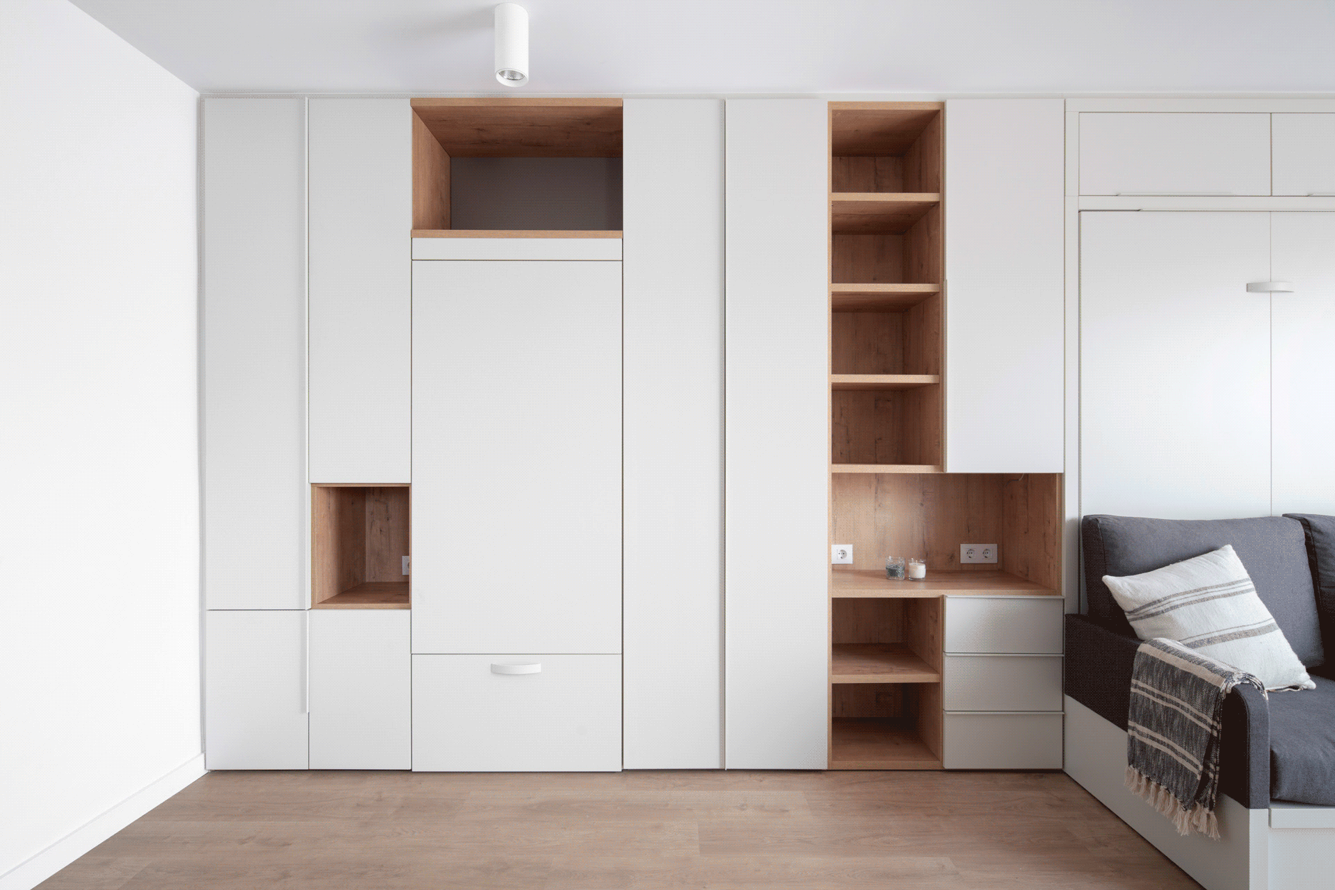 Un pequeño ático de apenas uso escasos 29m2 en pleno corazón de l’Eixample Barcelonés, muy bien situado y luminoso con una amplia terraza. La clave para resolver cada uno de los espacios mejorando respecto al estado inicial previo a la reforma fue la posibilidad de utilizar muebles convertibles. Todo el mobiliario se concentra en una franja de armarios de 45cm de profundidad y que engruesan la pared más larga de la vivienda.